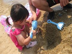 降ろそうとすると嫌がるので砂浜で砂遊びをしました
